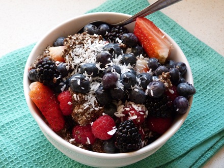 Well I’m now on to day three of my crazy work week and so far I am coping well. I had a late meeting last night but I had plenty of tasty eats throughout the day to see me through it! As I wouldn’t be able to make my body pump class in the evening I squeezed in a Davina DVD (Davina Super body Super Pump Workout) followed by a Yoga for Runners podcast. Breakfast was fantastic! I made up an overnight breakfast pudding using 2 tbsp of chia seeds, 3 tbsp of vanilla hemp protein powder, 1/4 cup of quinoa flakes, 1 tbsp of raw cacao powder (regular cocoa powder would also work) 1 tbsp of agave syrup, 1/2 cup of rice milk and about 1/2 – 1 cup of water all mixed together and left in the fridge overnight. In the morning I layered it up in a bowl with lots of fresh blueberries, strawberries, blackberries and raspberries then topped with a little coconut: